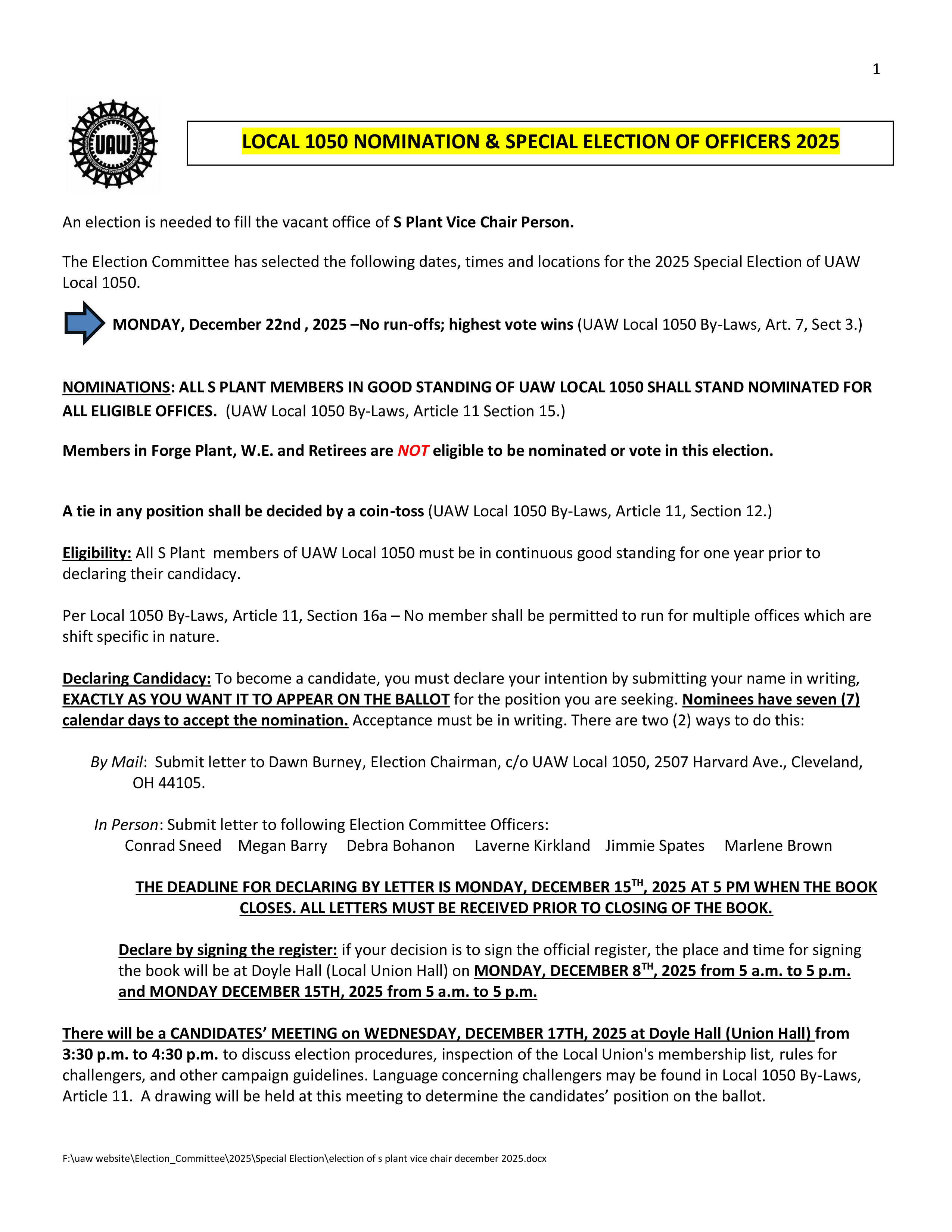 The Text and Graphics displayed are copyright �2006-2024 by the UAW Local 1050. All Rights Reserved. Use of any of the content posted on this website without prior written permission from the UAW Local 1050 is strictly prohibited. The UAW logo and the LUCA logo are registered trademarks of the UAW and are used with permission. All other copyrights and trademarks are the property of their respective owners. This web site is an official publication of the UAW Local 1050. The UAW Local 1050 makes every effort to ensure accuracy and reliability of the data contained in these documents. Every attempt is made to keep the information up-to-date and accurate however, the UAW Local 1050 makes no warranty, guarantee, or promise, expressed or implied, concerning the content of the documents. The UAW Local 1050 is not responsible for the content or accuracy of any pages linked to or referenced from this site nor does the UAW Local 1050 endorse the pages linked to or referenced from this site.