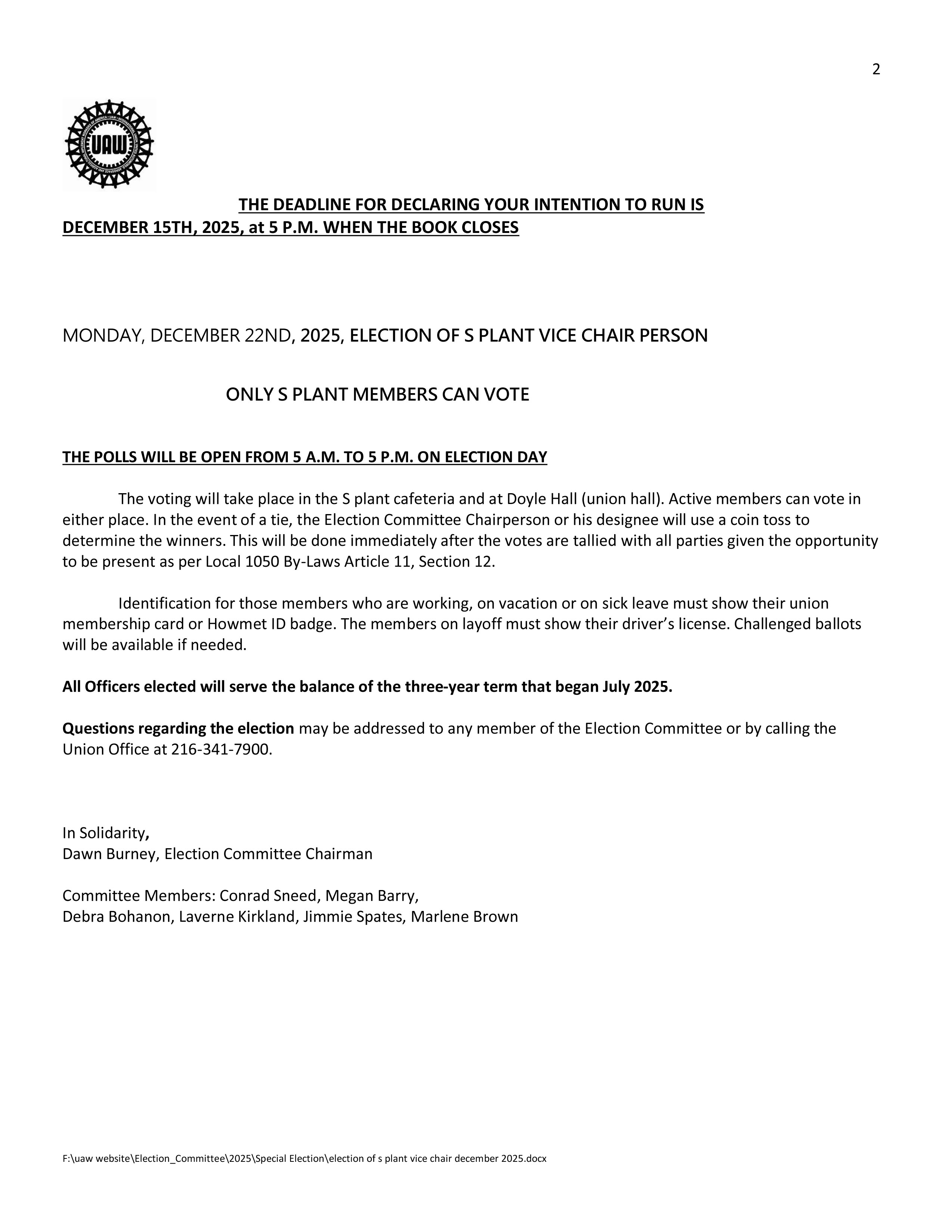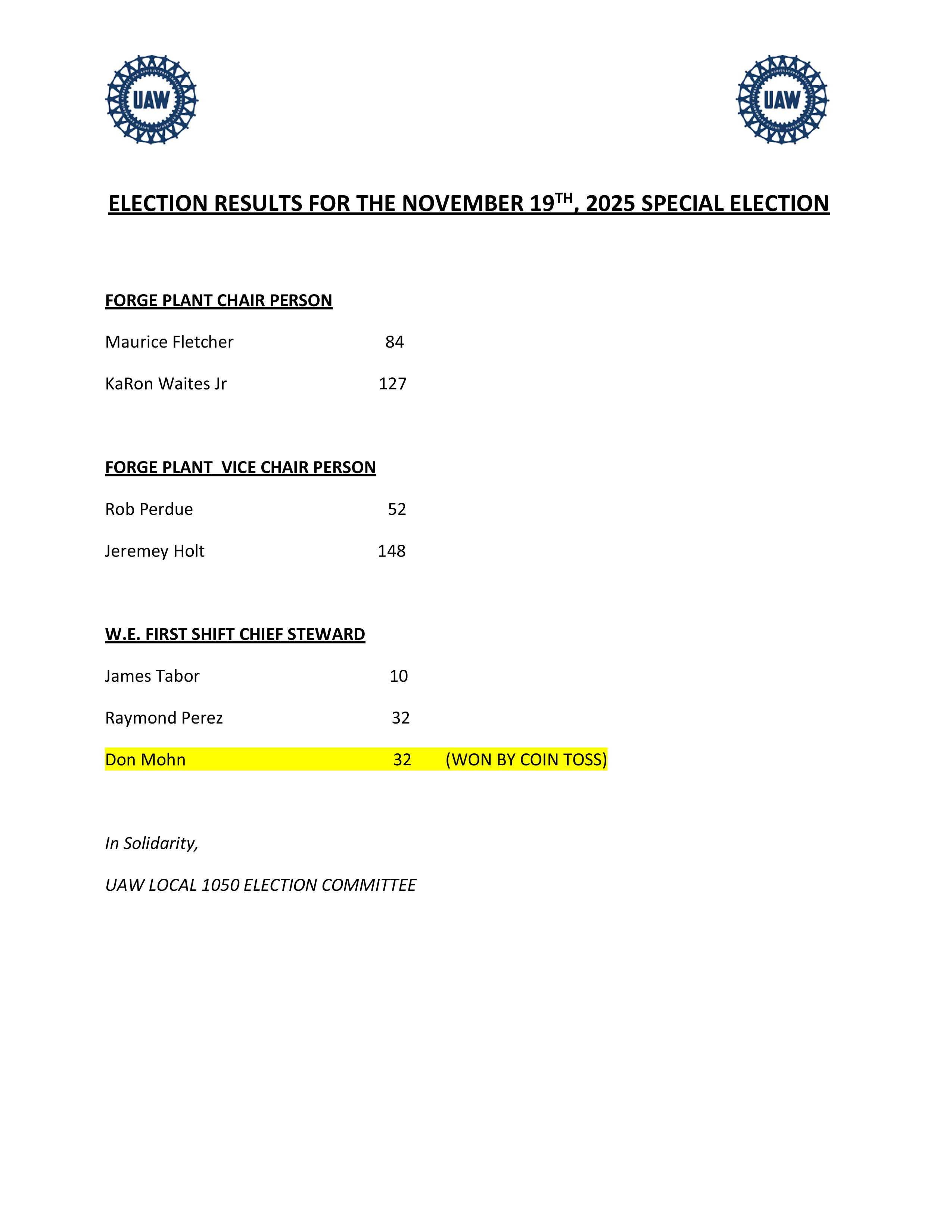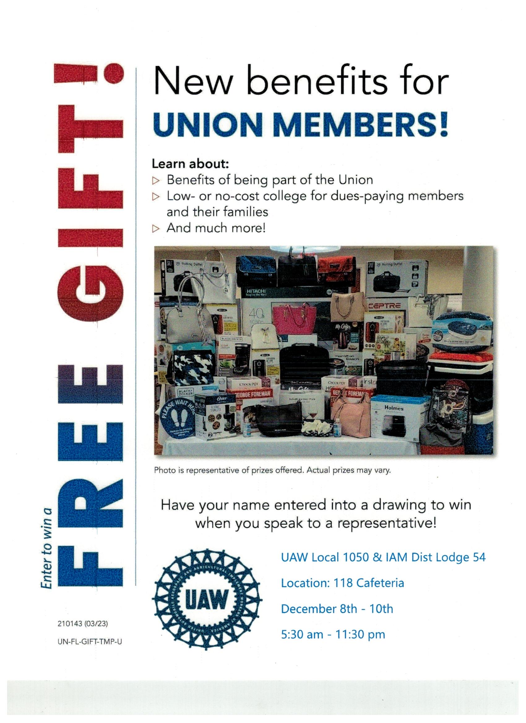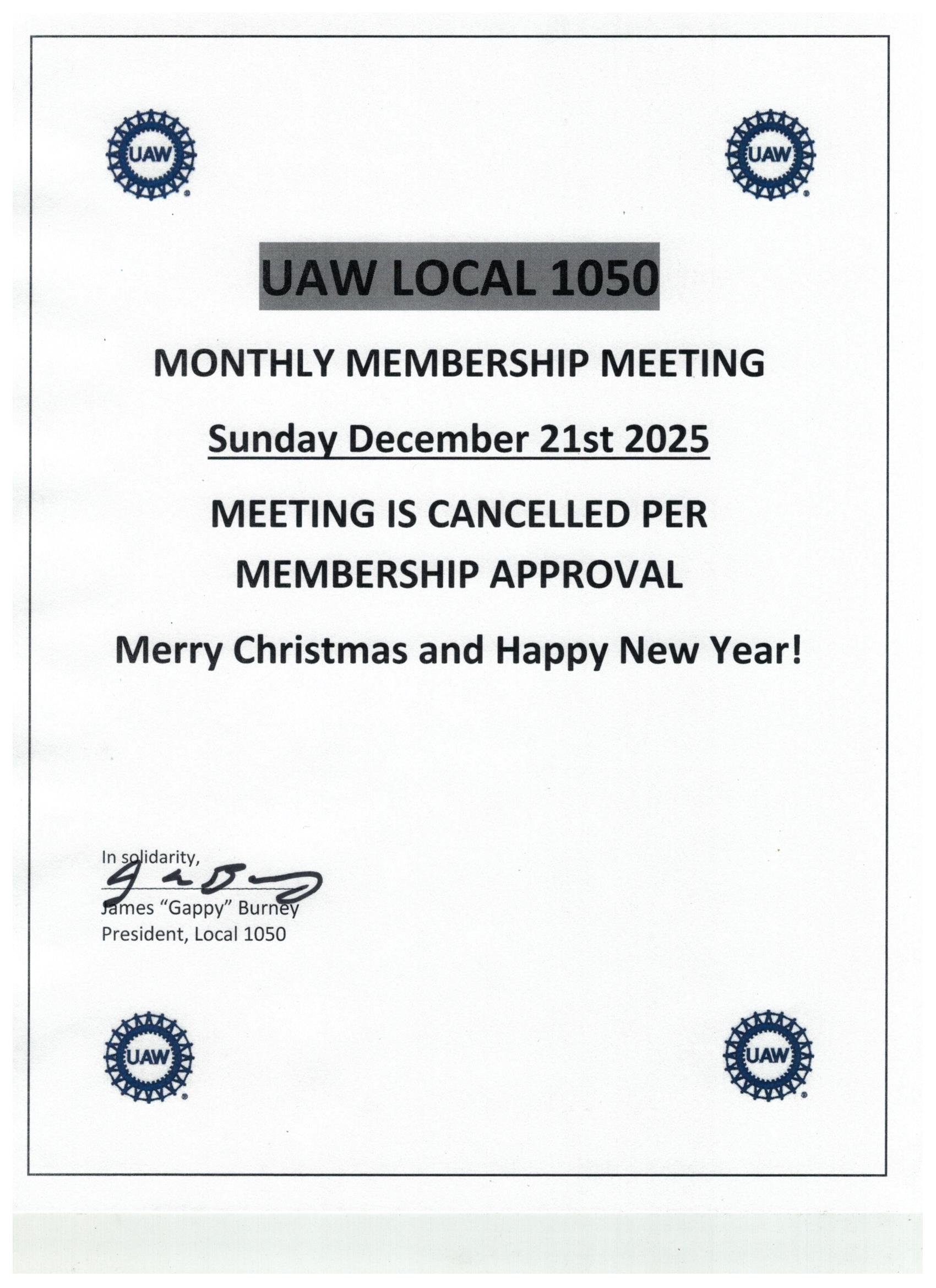The Text and Graphics displayed are copyright �2006-2024 by the UAW Local 1050. All Rights Reserved. Use of any of the content posted on this website without prior written permission from the UAW Local 1050 is strictly prohibited. The UAW logo and the LUCA logo are registered trademarks of the UAW and are used with permission. All other copyrights and trademarks are the property of their respective owners. This web site is an official publication of the UAW Local 1050. The UAW Local 1050 makes every effort to ensure accuracy and reliability of the data contained in these documents. Every attempt is made to keep the information up-to-date and accurate however, the UAW Local 1050 makes no warranty, guarantee, or promise, expressed or implied, concerning the content of the documents. The UAW Local 1050 is not responsible for the content or accuracy of any pages linked to or referenced from this site nor does the UAW Local 1050 endorse the pages linked to or referenced from this site.