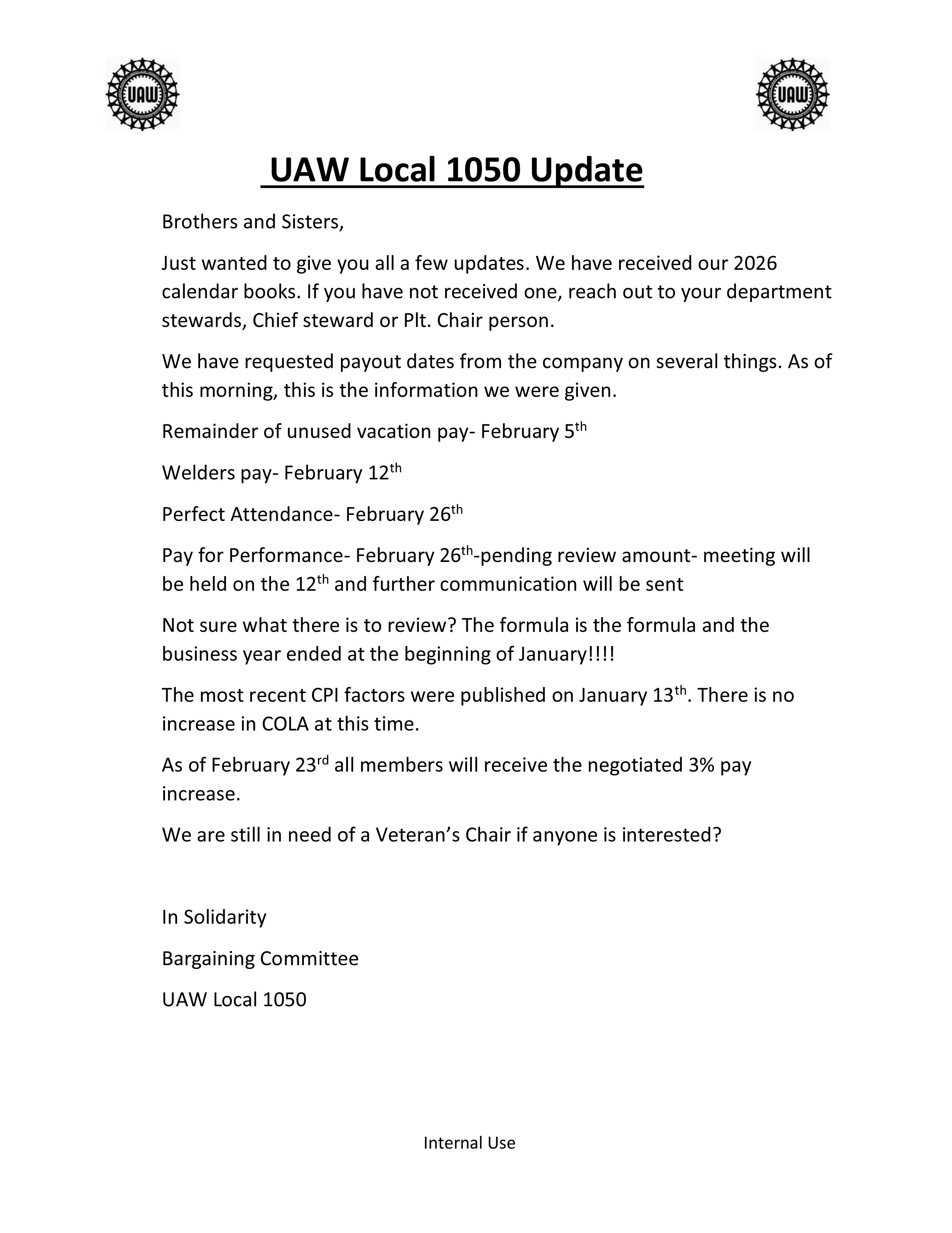 The Text and Graphics displayed are copyright �2006-2024 by the UAW Local 1050. All Rights Reserved. Use of any of the content posted on this website without prior written permission from the UAW Local 1050 is strictly prohibited. The UAW logo and the LUCA logo are registered trademarks of the UAW and are used with permission. All other copyrights and trademarks are the property of their respective owners. This web site is an official publication of the UAW Local 1050. The UAW Local 1050 makes every effort to ensure accuracy and reliability of the data contained in these documents. Every attempt is made to keep the information up-to-date and accurate however, the UAW Local 1050 makes no warranty, guarantee, or promise, expressed or implied, concerning the content of the documents. The UAW Local 1050 is not responsible for the content or accuracy of any pages linked to or referenced from this site nor does the UAW Local 1050 endorse the pages linked to or referenced from this site.