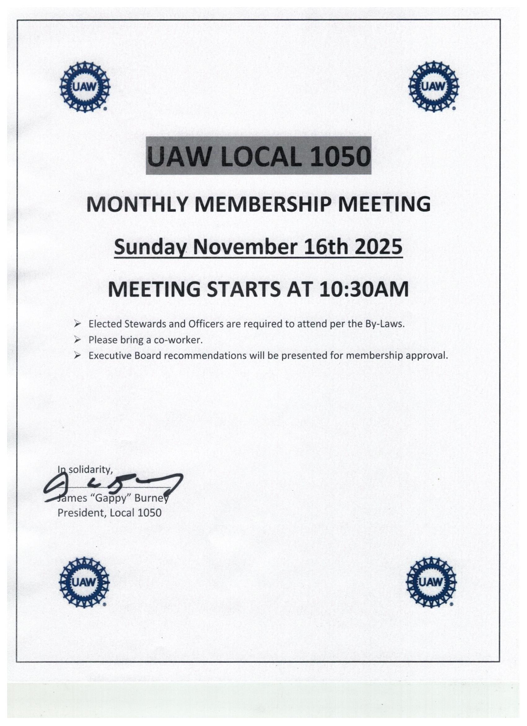 The Text and Graphics displayed are copyright �2006-2024 by the UAW Local 1050. All Rights Reserved. Use of any of the content posted on this website without prior written permission from the UAW Local 1050 is strictly prohibited. The UAW logo and the LUCA logo are registered trademarks of the UAW and are used with permission. All other copyrights and trademarks are the property of their respective owners. This web site is an official publication of the UAW Local 1050. The UAW Local 1050 makes every effort to ensure accuracy and reliability of the data contained in these documents. Every attempt is made to keep the information up-to-date and accurate however, the UAW Local 1050 makes no warranty, guarantee, or promise, expressed or implied, concerning the content of the documents. The UAW Local 1050 is not responsible for the content or accuracy of any pages linked to or referenced from this site nor does the UAW Local 1050 endorse the pages linked to or referenced from this site.
